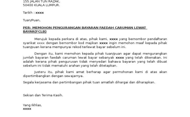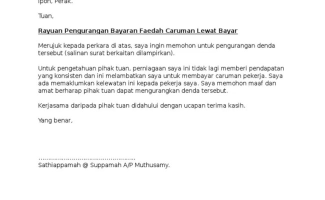 Contoh surat rayuan pengurangan bayaran perkeso sip, contoh surat. Surat permohonan untuk penalti lewat bayar pada perkeso.